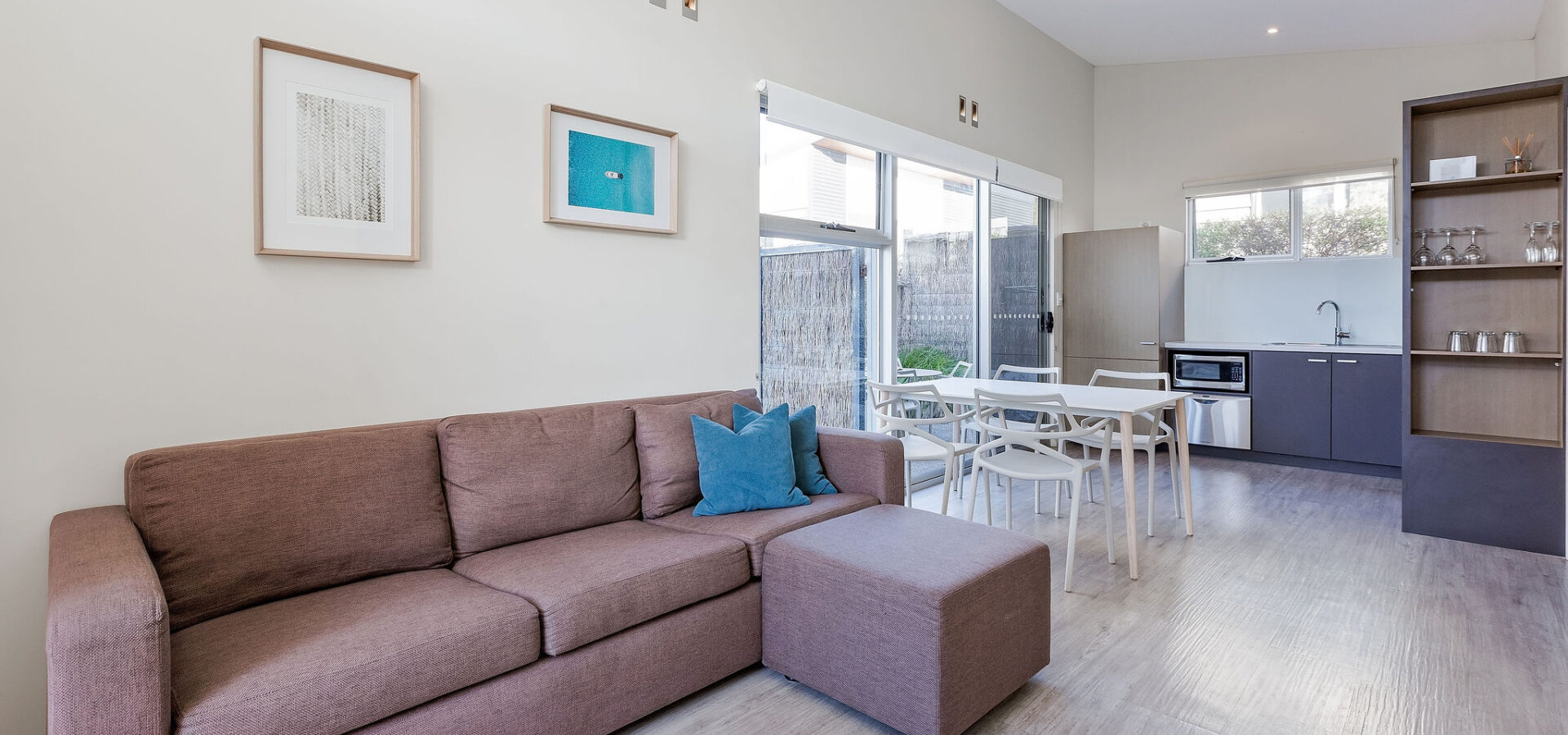 These thoughtfully designed shacks offer a queen bedroom with separate open plan living room featuring fully equipped kitchen plus sofa and dining.
